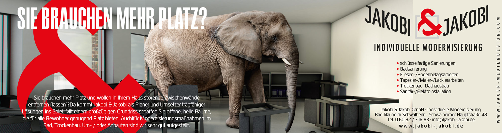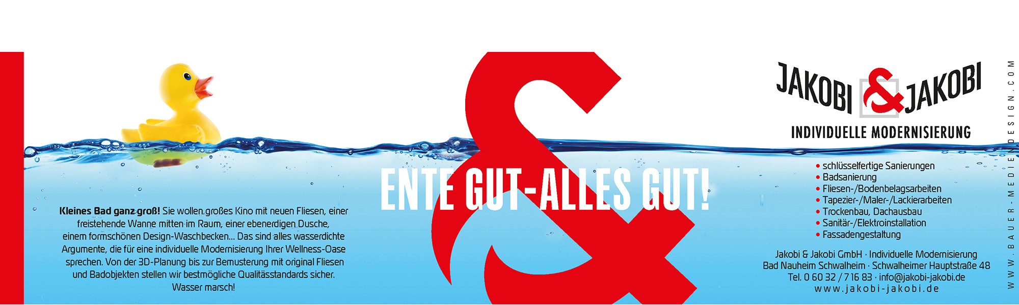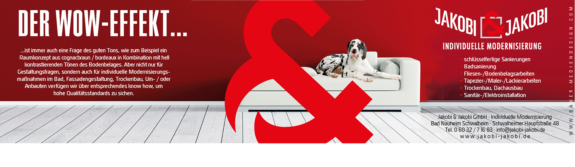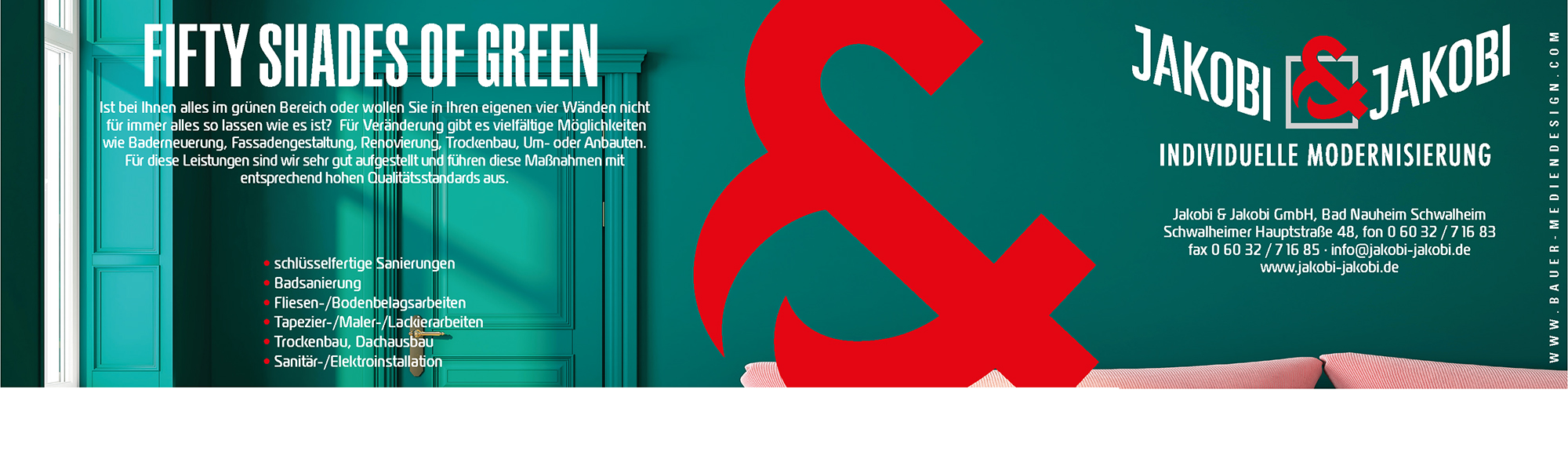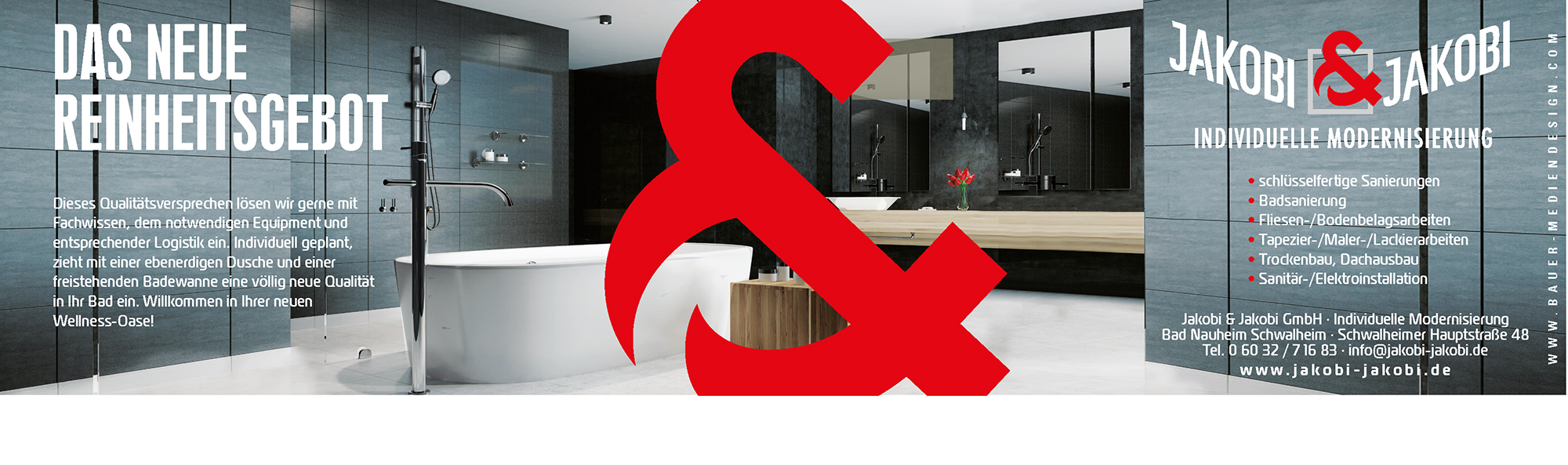 Die Jakobi & Jakobi GmbH, von Ralf Jakobi 1991 gegründet, ist seit über 30 Jahren im Rhein-Main-Gebiet und vor allem in der Wetterau zuständig für Baumaßnahmen rund ums Haus. Jakobi & Jakobi hat das Know-how, um in allen handwerklichen Bereichen hohe Qualitätsstandards zu sichern. Dazu gehören Modernisierung im Bad, Fassadengestaltung, Renovierung, Trockenbau, Um- oder Anbauten. BAUER MEDIENDESIGN entwickelte Corporate Design, Internet-Präsenz, und Anzeigen-Kampagne für die Tageszeitung. Zusätzlich liefert BAUER MEDIENDESIGN relevanten Content für Social Media.